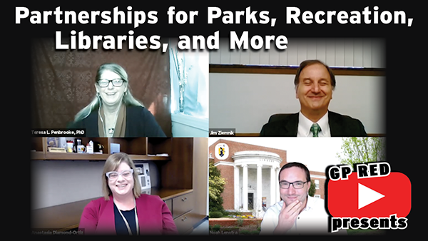 Parks and Recreation agencies are partnering with libraries now more than ever. In this episode, Teresa Penbrooke, PhD, CPRE (CEO of GreenPlay – www.greenplayllc.com, & Director of the Healthy Communities Research Group for GP RED – www.gpred.org) talks with Jim Ziemnik (Director at Lorain County Metro Parks) and Anastasia Diamond-Ortiz (Director of Lorain Public Library System) about the the benefits, obstacles, and considerations of their current partnership, along with some examples of the programs they’ve implemented together. Noah Lenstra, PhD, Assistant Professor of Library and Information Science at the University of North Carolina, Greensboro, joins the conversation with examples of how this fits within preventive health strategies and other quality of life partnerships, along with considerations when deciding to partner with another agency.