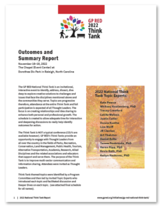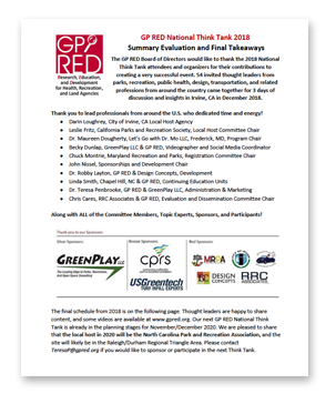 Since 2008, GP RED Think Tanks have provided an opportunity to engage with Thought Leaders in the fields of Parks, Recreation, Conservation, Land Management, Public Health, Tourism, Alternative Transportation, Academia, Allied Disciplines and the related associations and educators that support and serve them. The purpose of the Think Tank is to improve multi-sector communication and information sharing.