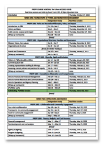 Course Topics – Course topics span the range of important and foundational skills in public management and parks and recreation including public service and parks and recreation philosophy, value and impact; organizational structure, function and governance; diversity, equity and inclusion; finance, budgets and cost recovery; program planning and evaluation; collaboration and community engagement; facilities/parks planning and management; human resources and communication.